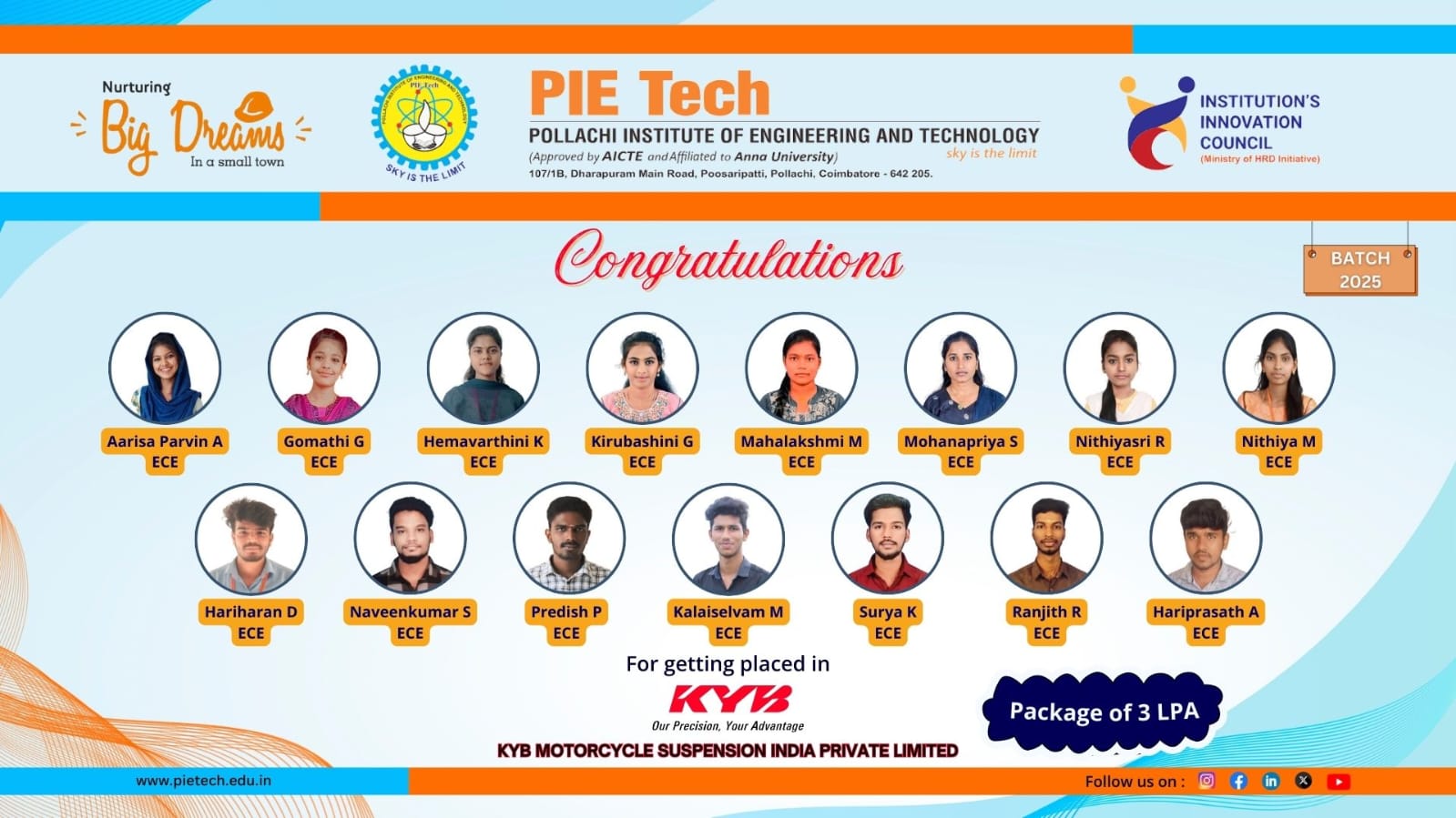 Pollachi Institute of Engineering & Technology (PIE Tech) was established in 2012 with a mission of providing competent technical education and creating proficient engineers who will add newer dimensions to the technical arena and thereby serve the need of the Indian Society as a whole. Its commitment is best encapsulated in its vision to become a globally recognized institute of engineering. Read more