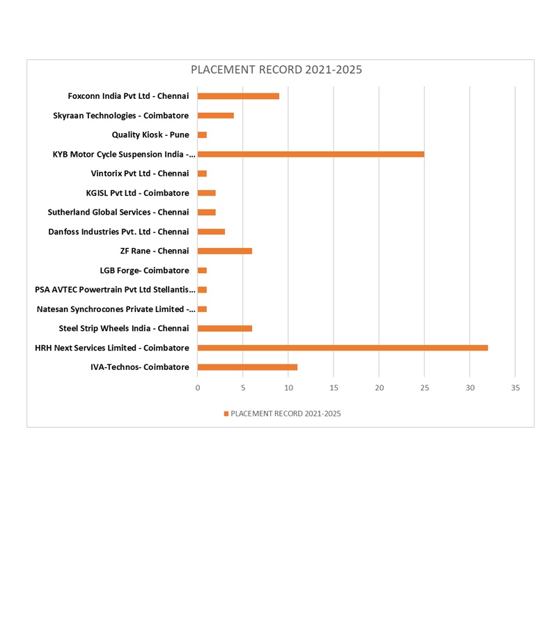 "Placement 2025 : TCS-5 | Wipro-3 | Infosys-8 | KGiSL-2 | Tech Mahindra-2 | Zoho-1 | Deloitte-1 | Steel Strip Wheels India-6 | Natesan-1 | PSA AVTEC-1 | LGB-1 | ZF Rane-6 | Danfoss-3 | Sutherland-2 | Vintroix-1 | KYB-30 | Quality Kiosk-1| HRH Next-41 | Skyraan-4 | Foxconn-9 | IVA Technos-11